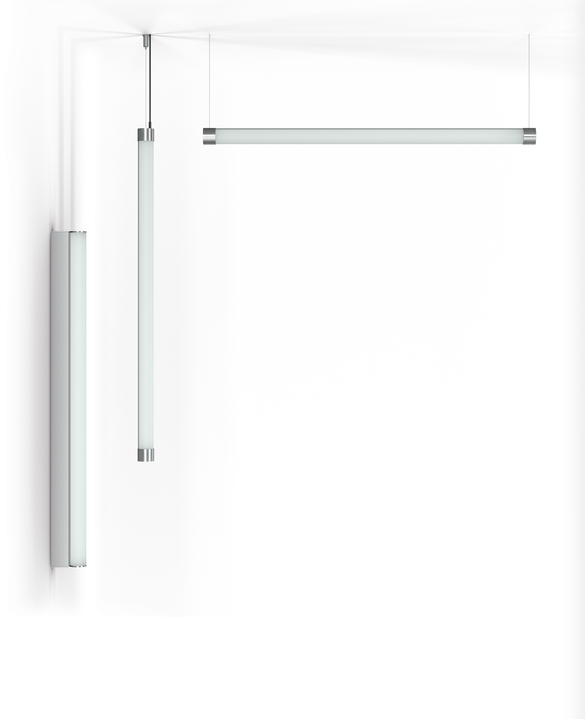XOOTUBEは、壁や天井に直付けするだけでなく、水平・垂直の両方向にペンダントとして取り付けることが可能です。XOOTUBEは、全方向から均質な光を出力します。